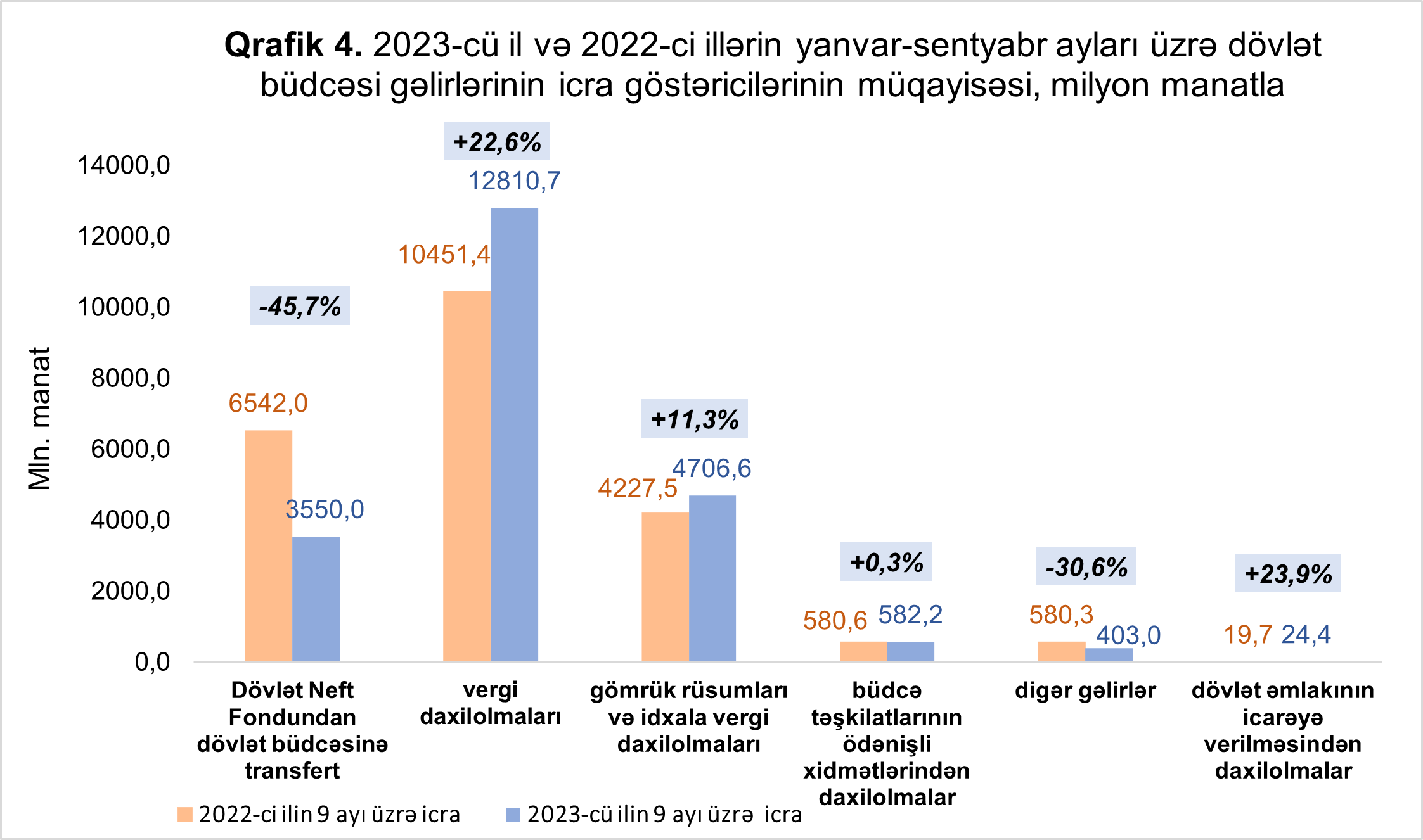 2023-cü ilin yanvar-sentyabr ayları üzrə dövlət büdcəsinin gəlirləri 2022-ci ilin müvafiq dövrü ilə müqayisədə vergi daxilolmaları üzrə 2 milyard 359,3 milyon manat və ya 22,6 faiz çox, gömrük rüsumları və idxala vergi daxilolmaları üzrə 479,1 milyon manat və ya 11,3 faiz çox, büdcə təşkilatlarının ödənişli xidmətlərindən daxilolmalar üzrə 1,6 milyon manat və ya 0,3 faiz çox, dövlət əmlakının icarəyə verilməsindən daxilolmalar üzrə 4,7 milyon manat və ya 23,9 faiz çox, digər gəlirlər üzrə isə 177,3 milyon manat və ya 30,6 faiz az, Dövlət Neft Fondudan dövlət büdcəsinə transfert üzrə 2 milyard 992,0 milyon manat və ya 45,7 faiz az icra edilmişdir.