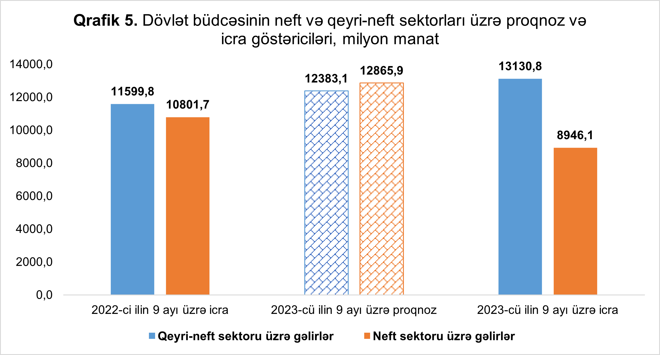 Dövlət büdcəsinin neft-qaz sektoru üzrə daxilolmaları 8 milyard 946,1 milyon manat təşkil etmişdir ki, bu da proqnozla müqayisədə 3 milyard 919,7 milyon manat və ya 30,5 faiz az (Dövlət Neft Fondundan nəzərdə tutulandan 2 milyard 992,0 milyon manat az vəsaitin daxil olması ilə əlaqədar), 2022-ci ilin müvafiq dövrü ilə müqayisədə isə 1 milyard 855,6 milyon manat və ya 17,2 faiz azdır.