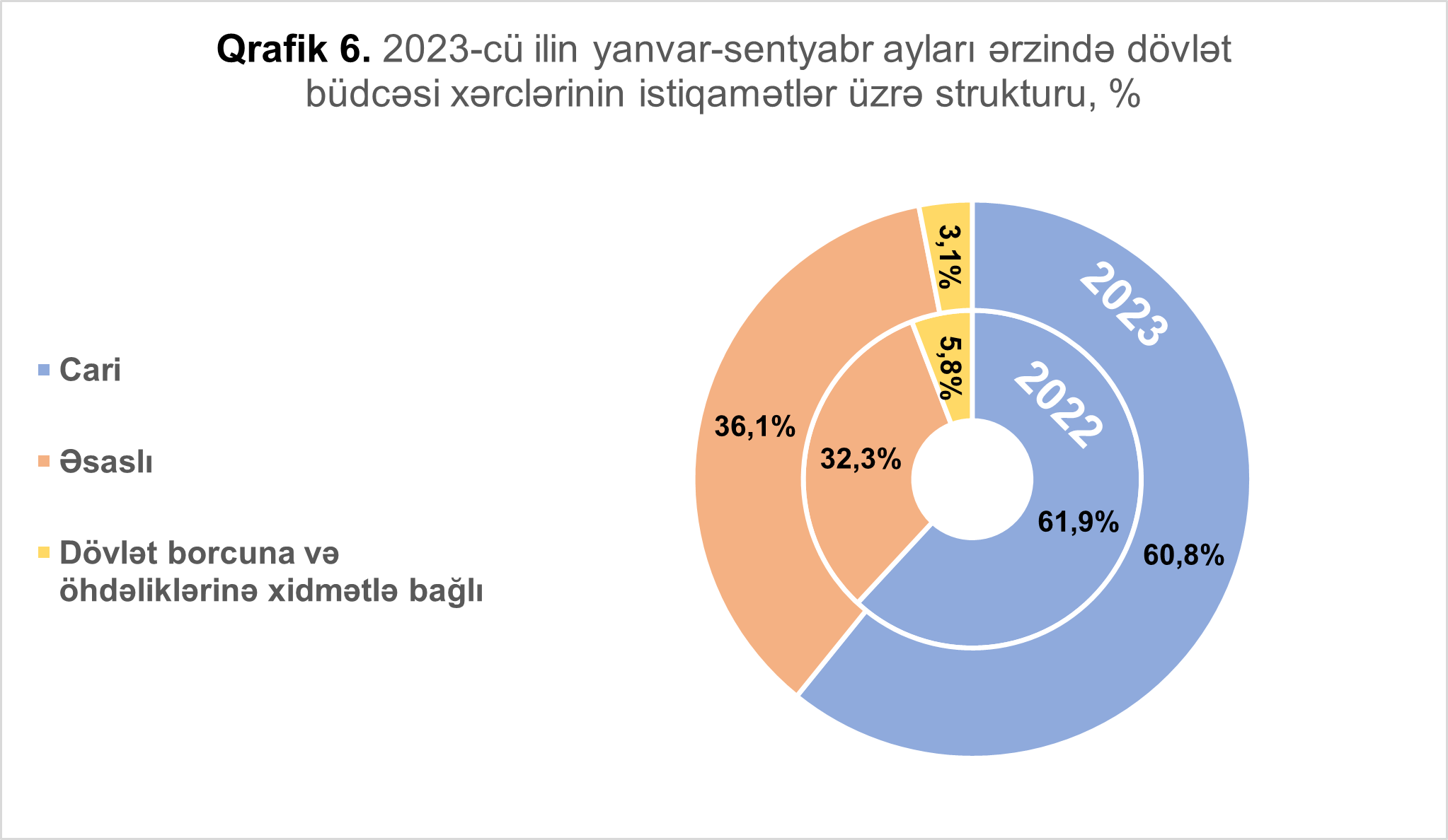 2023-cü ilin yanvar-sentyabr ayları ərzində dövlət büdcəsi xərclərinin 14 milyard 118,4 milyon manatı və ya 60,8 faizi cari xərclərə, 8 milyard 382,4 milyon manatı və ya 36,1 faizi əsaslı xərclərə, 713,7 milyon manatı və ya 3,1 faizi dövlət borcuna və öhdəliklərinə xidmətlə bağlı xərclərə yönəldilmişdir.