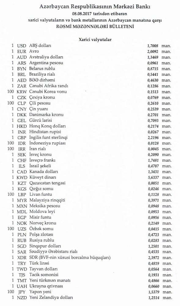 Avqustun 7-də rəsmi olaraq 1 dollar 1,7008 manata, 1 avro isə 2.0061 manata bərabər idi.