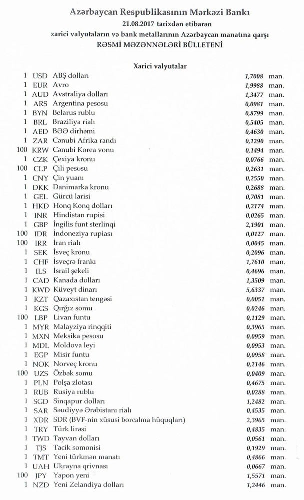 Avqustun 21-nə Mərkəzi Bankın açıqladığı rəsmi Dollar/manat məzənnəsi Avqustun 18-i ilə müqayisədə dəyişməyərək 1,7008 manat olub, Avro/manat məzənnəsi isə 1.9988 manata qalxıb.
