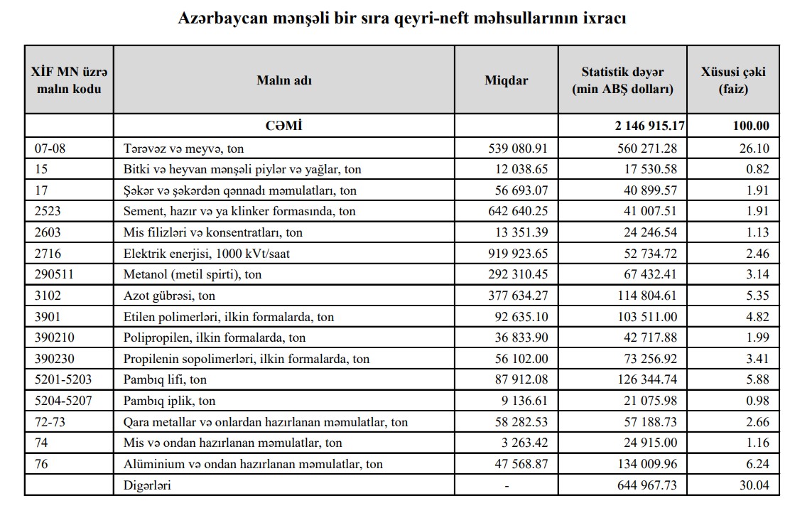 2024-cü ilin 8 ayında Azərbaycanın 2 milyard 179 milyon 882 min dollarlıq qeyri-neft məhsulları ixracının 752 milyon 15 min dolları və ya 34,50%-i Rusiyaya ixrac olunmuşdu.