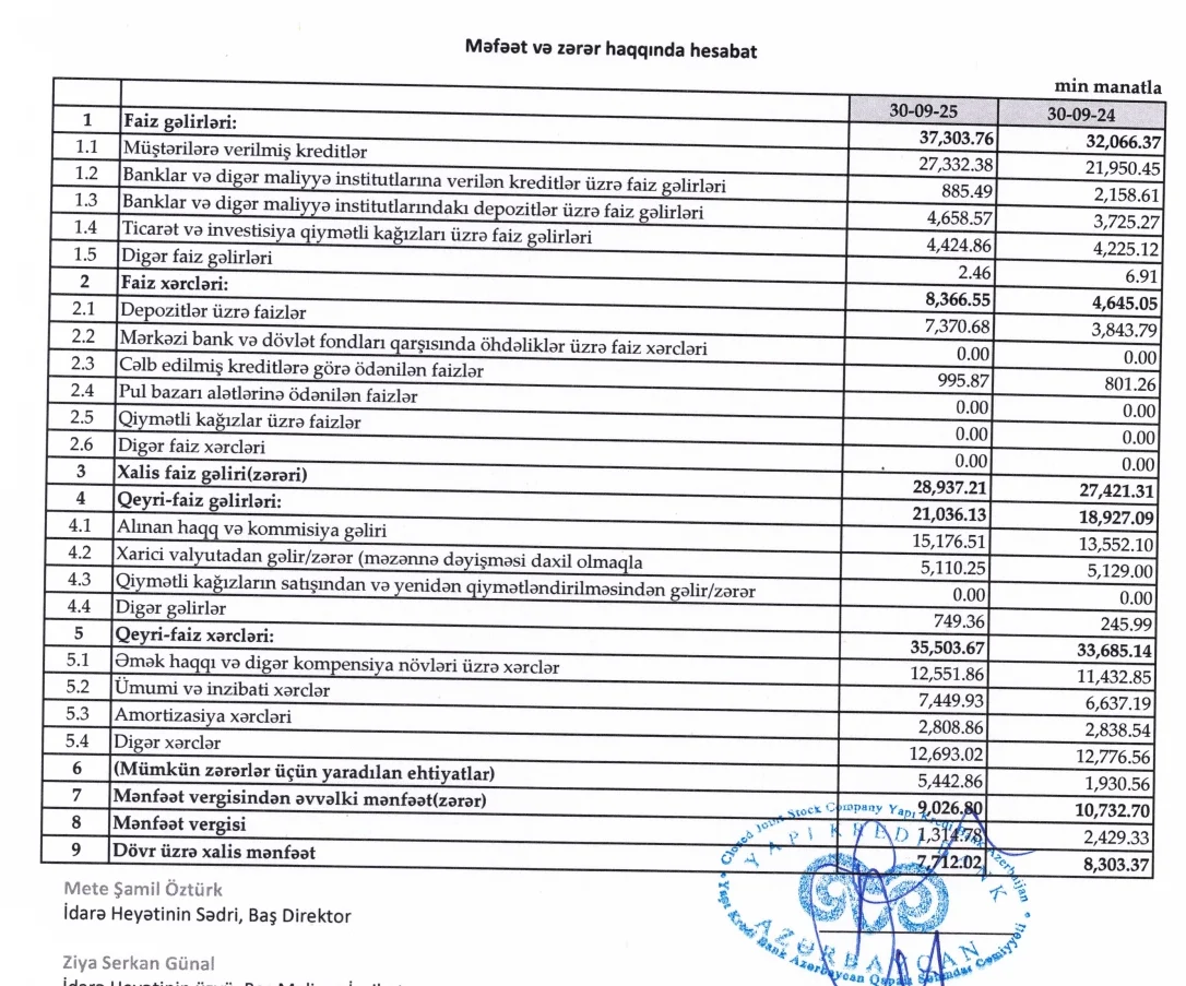 2025-ci ilin ilk doqquz ayında “Yapı Kredi Bank Azərbaycan” əməliyyat gəlirlərində, kredit portfelində və kapitalında artım, lakin depozitlərdə və xalis mənfəətdə azalma ilə yadda qalıb. Bankın əməliyyat mənfəəti və kreditləşmə həcmlərinin artması fəaliyyətin aktivləşdiyini göstərir. Eyni zamanda, faiz xərclərinin, mümkün zərərlər üçün yaradılan ehtiyatlara ayrılan vəsaitin kəskin yüksəlməsi və depozitlərin azalması gələcək dövrlərdə mənfəətlilik baxımından təhlil tələb edən əsas istiqamətlər kimi qalır.