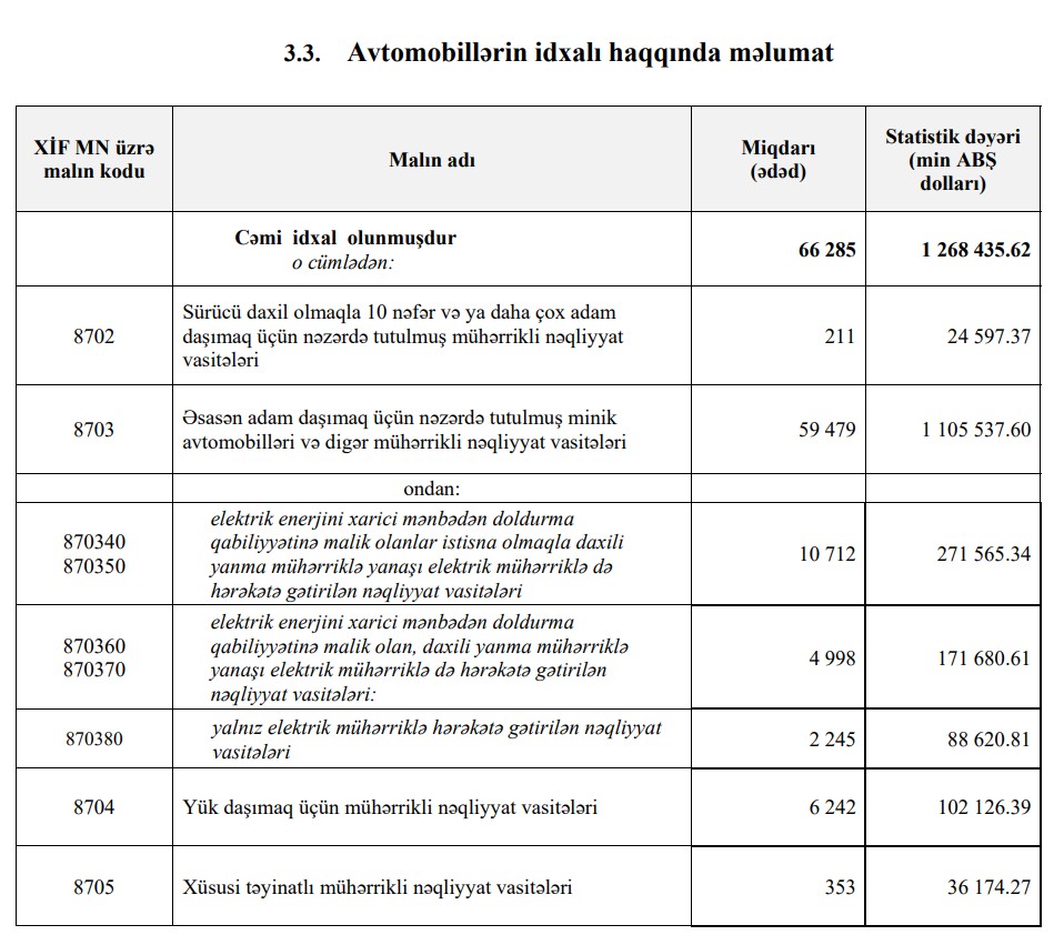 2025-ci ilin 9 ayı ərzində Azərbaycana 45 min 987 ədəd hibrid, plagin-hibrid və tam elektrik nəqliyyat vasitəsi idxal olunub. Bu idxal üçün 916 milyon 829 min dollar sərf edilib.