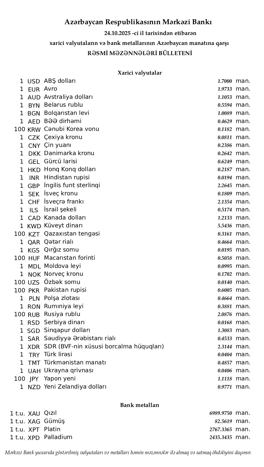 Rəsmi məzənnələr açıqlandı