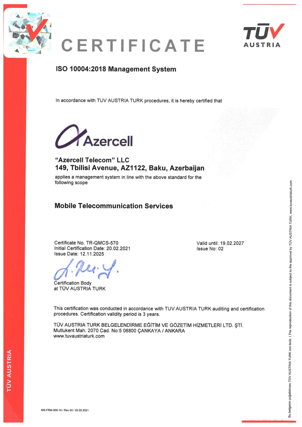 Qeyd edək ki, Azercell ISO 10004:2018 standartı üzrə ilk sertifikatını 2021-ci ildə qazanıb. Şirkət ardıcıl olaraq dördüncü dəfə ISO 10004 sertifikatına layiq görülür.