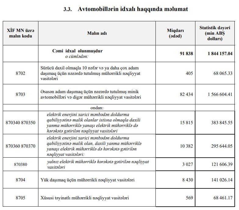 2025-ci ildə Azərbaycana 2 milyard 386 milyon 505 min dollar dəyərində 123 min 319 ədəd nəqliyyat vasitəsi (avtomobil) idxal olunub.