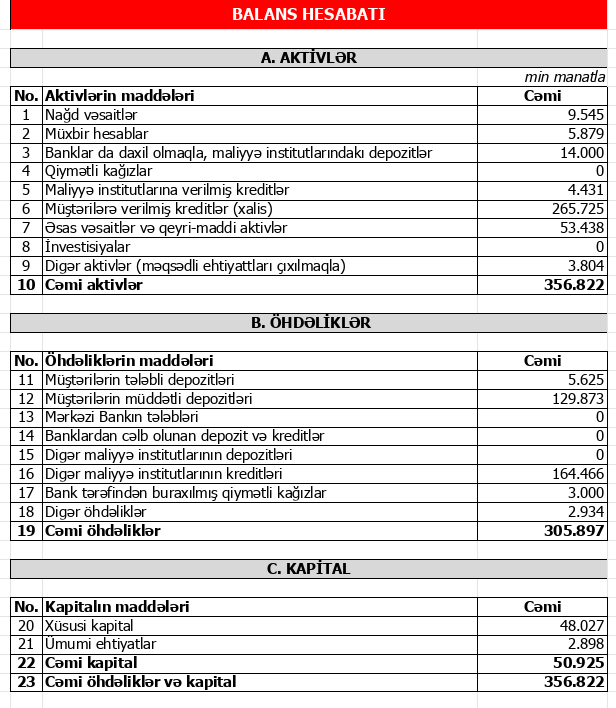 2025-ci ilin sonuna Bankın cəmi aktivləri 356 milyon 822 min manat olub. Bu, 2024-cü ilin sonundakı 362 milyon 817 min manatla müqayisədə 5 milyon 995 min manat və ya 1,7 faiz azalma deməkdir.