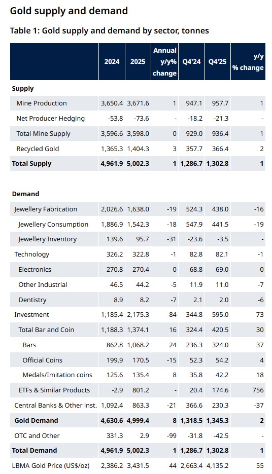 World Gold Council (WGC) tərəfindən yayımlanan “Gold Demand Trends: Q4 and Full Year 2025” hesabatına görə, qlobal qızıl tələbi 2025-ci ildə ilk dəfə 5000 ton səviyyəsini keçərək tarixi bir həddi aşıb. Hesabatda göstərilir ki, qlobal qızıl tələbi əsasən investisiya yönümlü artımın təsiri ilə rekord səviyyəyə çatıb. Qızıl ETF-ləri* və külçə-sikkə alışları ön plana çıxarkən, mərkəzi bankların alışları da yüksək səviyyəsini qoruyub.