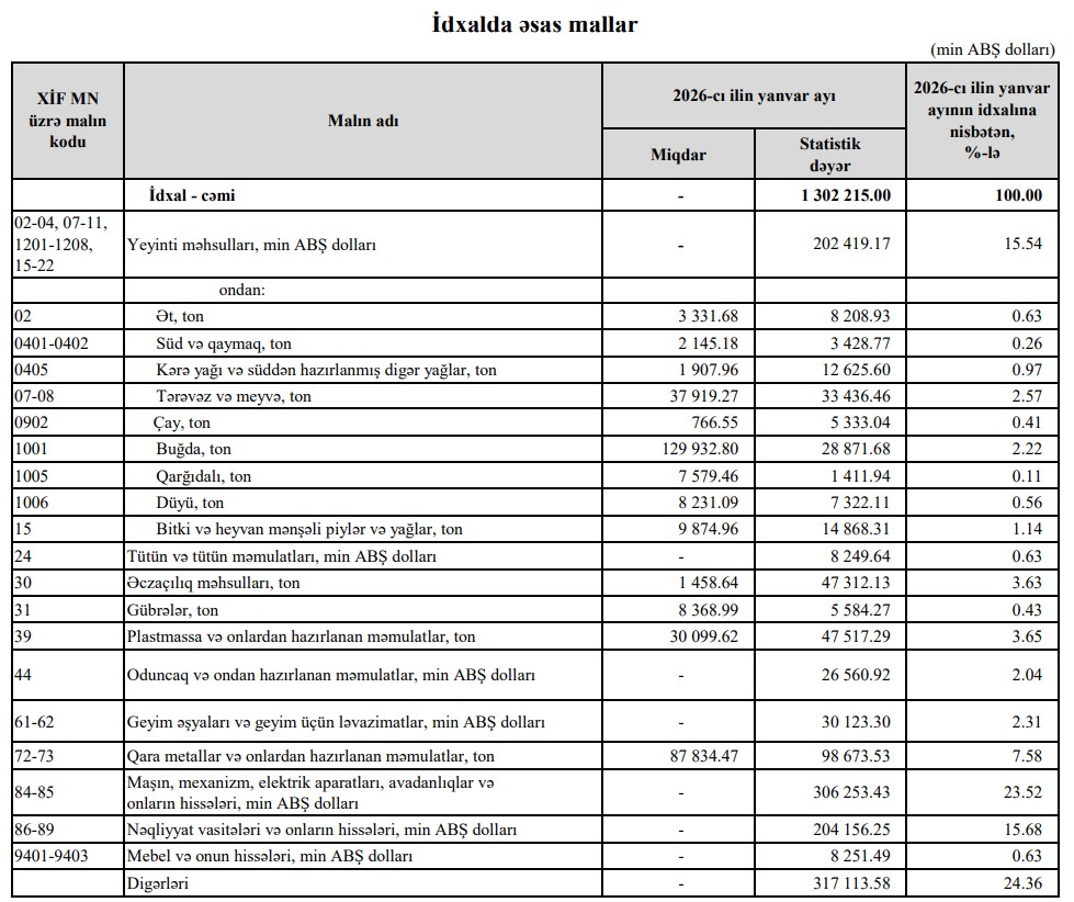 2026-cı ilin yanvar ayında Azərbaycanın ən çox ixrac və idxal etdiyi mallar.
