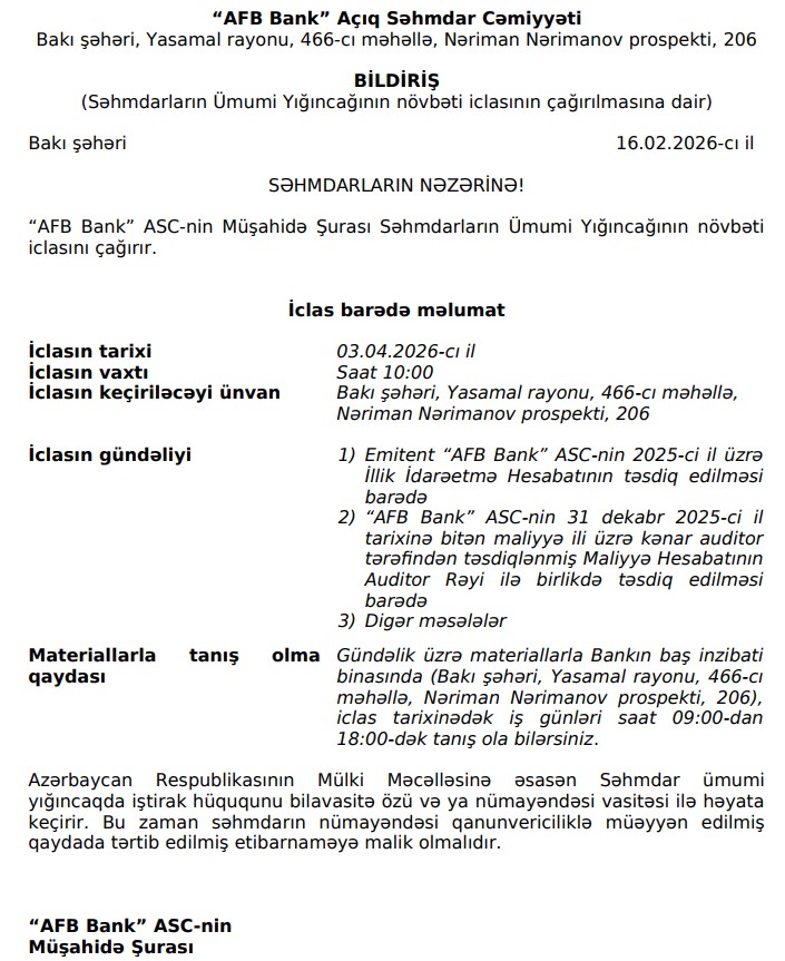 03 Mart 2026-cı il tarixində “AFB Bank” ASC səhmdarlarının Ümumi Yığıncağının növbəti iclası keçiriləcək.
