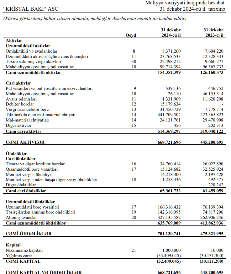 31 dekabr 2025-ci il tarixində "Kristal Bakı" ASC 668 milyon 722 min manat cəmi kativlərə malik olub. Şirkət 2023-cü ilin sonunda 445 milyon 201 min manat cəmi aktivlərə malik idi (2024-cü ildə cəmi aktivləri 223 milyon 521 min manat və ya 50,2% artıb). Həmçinin, 2024-cü ilin sonunda "Kristal Bakı" şirkətinin 33 milyon 409 min manat yığılmış zərəri olub (2023-cü ilin sonunda 30 milyon 131 min manat)