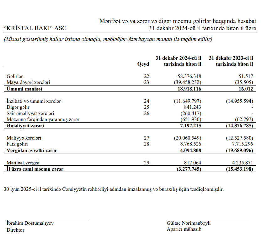 İnşaat fəaliyyətlərilə məşğul olan "Kristal Bakı" ASC 2024-cü ili 3 milyon 278 min manat xalis zərər ilə başa vurub. Şirkət 2023-cü ili 15 milyon 453 min manat xalis zərər ilə bağlamışdı. Beləliklə, "Kristal Bakı" şirkətinin xalis zərəri 2024-cü ildə 2023-cü illə müqayisədə 12 milyon 175 min manat və ya 4,7 dəfə azalıb. Qeyd edək ki, "Kristal Bakı" layihələri üzrə 2024-cü ildən daha böyük məbləğdə gəlir əldə etməyə başlayıb.