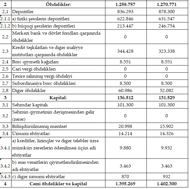 "Rabitəbank"da deozitlər isə 42 milyon 7 min manat və ya 4,8% azalaraq 836 milyon 293 min manata düşüb. İlk rübdə həm fiziki, həm də hüquqi şəxslərin depoitləri azalıb.