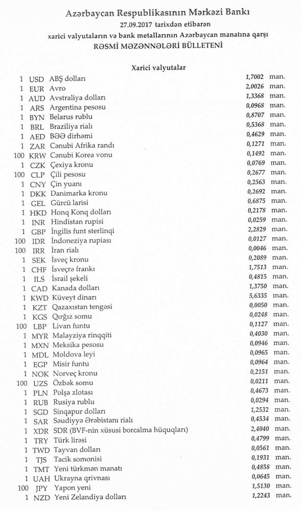 Sentyabrın 27-nə Mərkəzi Bankın açıqladığı rəsmi Dollar/manat məzənnəsi Sentyabrın 26-sı ilə müqayisədə düşərək 1,7002 manat olub, Avro/manat məzənnəsi isə 2.0026 manata düşüb.