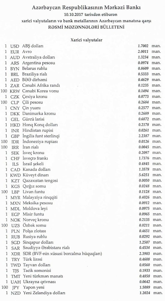 Oktyabrın 9-da rəsmi olaraq 1 dollar 1,7002 manata, 1 avro isə 1.9953 manata, 1 Rubl 0,0292 manata bərabər idi.