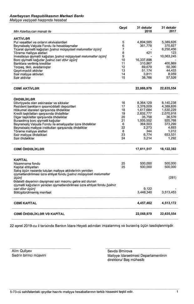2018-ci ildə AMB-nin cəmi öhdəlikləri 2,8% azalaraq 17 milyard 611 milyon 517 min manat, o cümlədən dövriyyədə olan əsklinaslar və sikkələr 2,75% artaraq 8 milyard 364 milyon 129 min manat, rezident bankların qısamüddətli depozitləri 23% azalaraq 3 milyard 378 milyon 509 min manat, kredit təşkilatları qarşısında öhdəliklər 36,8% artaraq 2 milyard 832 milyon 777 milyon manat, hökumət idarələri qarşısında öhdəliklər 5,7% artaraq 1 milyard 61 milyon 684 min manat, buraxılmış borc qiytmətli kağızlar isə 9,2% artaraq 1 milyard 5 milyon 552 min manat, qurumun cəmi kapitalı isə 1,2% azalaraq 4 milyard 45 milyon 462 min. manat olub.
