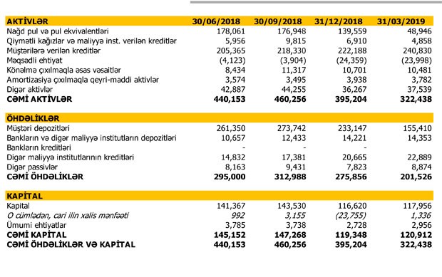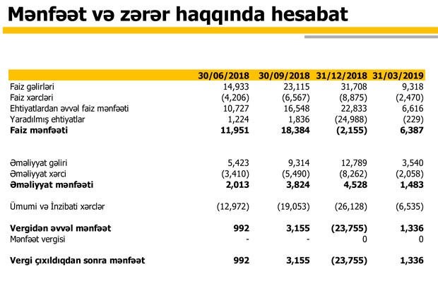 Müqayisə üçün qeyd edək ki, 2018-ci ilin 1-ci rübündə “Expressbank”ın cəmi gəlirləri 10 milyon 689 min manat, cəmi xərcləri 9 milyon 941 min manat, mənfəəti 749 min manat təşkil etmişdi.