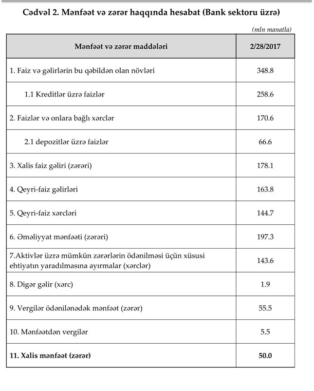 2016-cı ili 1 milyard 668 milyon manat, 2017-ci ilin yanvar ayını isə 496 milyon manat zərər ilə başa vuran bank sektoru, 28 Fevral 2017-ci il tarixinə olan məlumata görə, Fevralda 50 milyon manat xalis mənfət təmin edə bilib.