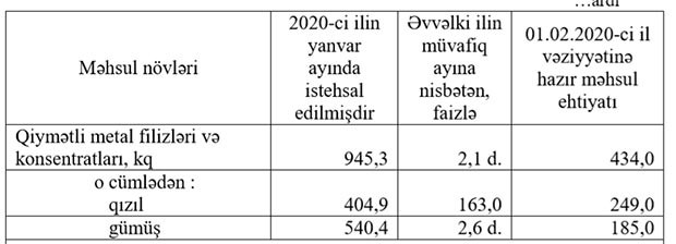 2020-ci ilin yanvar ayında Azərbaycanda 404,9 kq qızıl, 540,4 kq gümüş istehsal edilib.