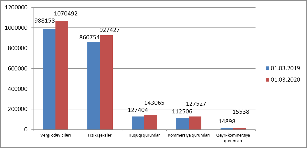 2020-ci ilin mart ayının 1-nə respublika üzrə 1 milyon 70 min 492 vergi ödəyicisi uçotdadır. Onlardan 927 min 427-si və ya 86,6 faizi fiziki şəxs, 143 min 65-i və ya 13,4 faizi hüquqi şəxslər və digər təşkilatlar olub.