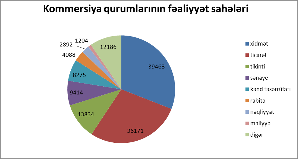 2020-ci ilin martın 1-nə qeydiyyatda olan kommersiya qurumlarının 39 min 463-ü xidmət, 36 min 171-i ticarət sektorunda fəaliyyət göstərib.