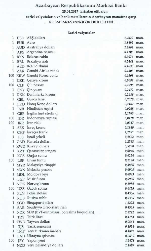 Aprelin 24-də rəsmi olaraq 1 dollar 1,7022 manata, 1 avro isə 1.8484 manata bərabər idi.