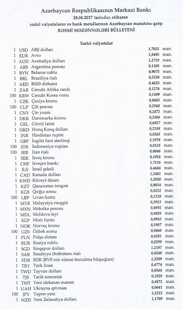 Aprelin 27-də rəsmi olaraq 1 dollar 1,7025 manata, 1 avro isə 1.8566 manata bərabər idi.