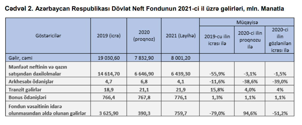 Fondun 2021-ci ildə 2019-cu ildəkindən 60%-ə yaxın az gələr əldə edəcəyi gözlənilir2021-ci ildə Dövlət Neft Fondunun gəlirləri 8 milyard 1,2 milyon manat həcmində proqnozlaşdırılmışdır ki, bu da 2019-cu ilin müvafiq icra göstəricisindən 11 milyard 29,4 milyon manat və ya 58% az, 2020-ci ilin proqnozundan 168,3 milyon manat və ya 2,1 % çox, 2020-ci ilin gözlənilən icra göstəricisindən 891,1 milyon manat və ya 10,0% azdır.