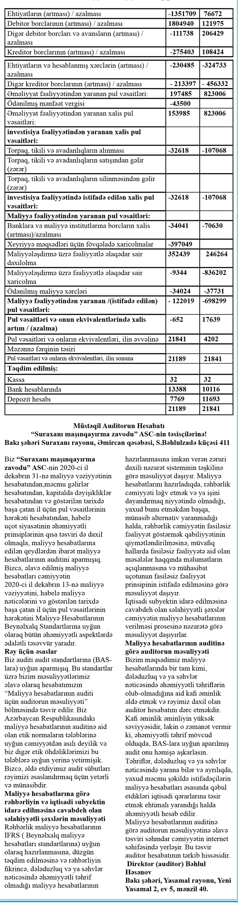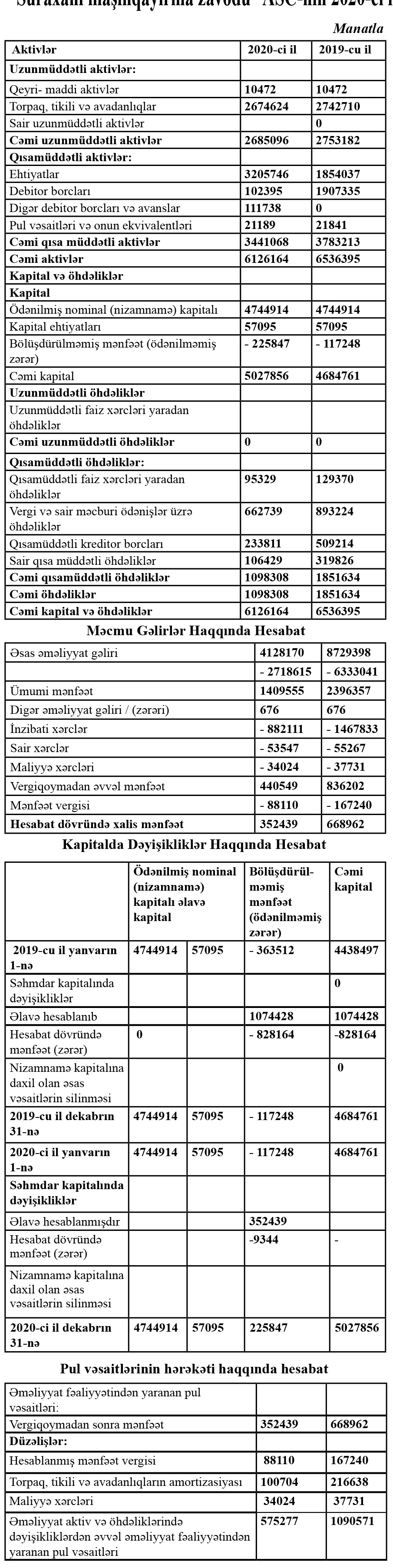 “Suraxanı maşınqayırma zavodu” ASC-nin 2020-ci il dekabrın 31-nə maliyyə vəziyyəti haqqında hesabatı