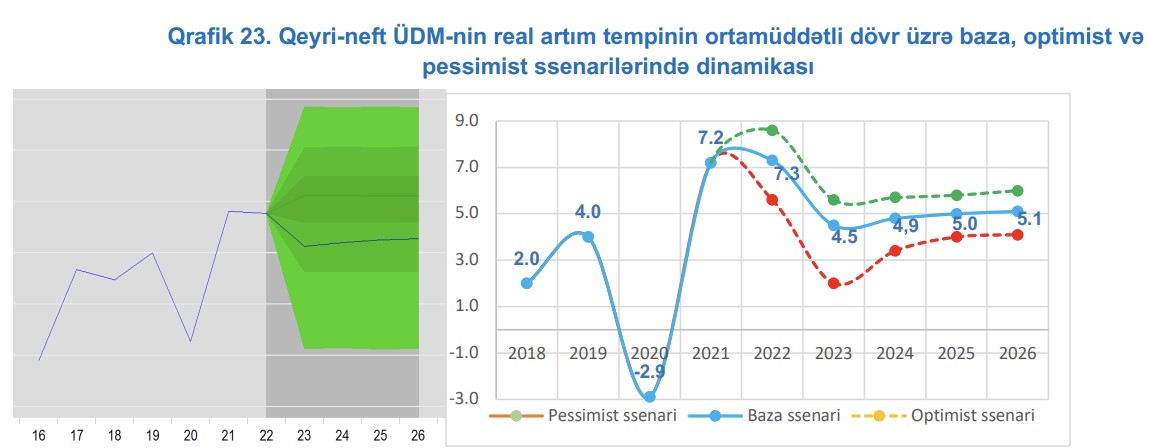 Qeyri-neft ÜDM-nin 2022-2026-cı illər üzrə orta illik artım tempi isə baza/hədəf ssenaridə 5,4 faiz, optimist ssenaridə 6,3 faiz, pessimist ssenaridə 3,8 faiz proqnozlaşdırılmışdır.