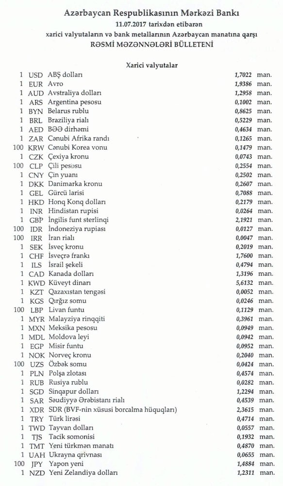 İyulun 11-nə Mərkəzi Bankın açıqladığı rəsmi Dollar/manat məzənnəsi İyulun 10-u ilə müqayisədə dəyişməyərək 1,7022 manat olub, Avro/manat məzənnəsi isə 1.9386 manata düşüb.